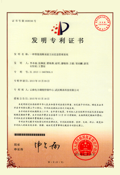 我国发明专利的授权率长期保持在较低水平。据南方电网科技部不完全统计,截至2014 年6 月末,我国电力系统行业发明专利的授权率仅占总申请量的约16%,其中软件类发明专利的授权率更低,占总申请量的不足6%。此次“一种智能故障录波主站信息管理系统”的授权证明了公司研发团队创新、务实的精神,也增进了公司同云南电网的技术交流合作,意义重大。