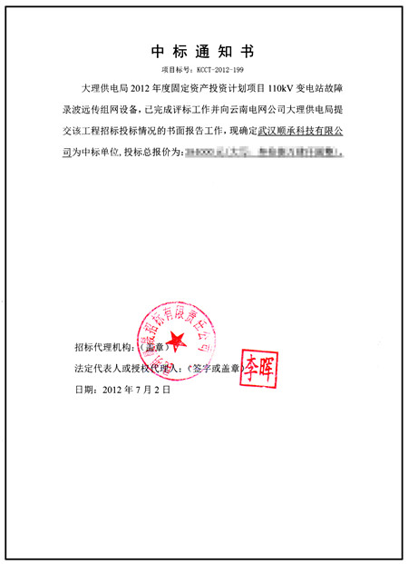 热烈祝贺我公司中标云南电网公司大理供电局“2012 年度固定资产投资计划项目110 kV变电站故障录波远传组网设备采购”项目。该项目为云南电网首个录波组网项目,标志着公司正式进入云南电网市场。