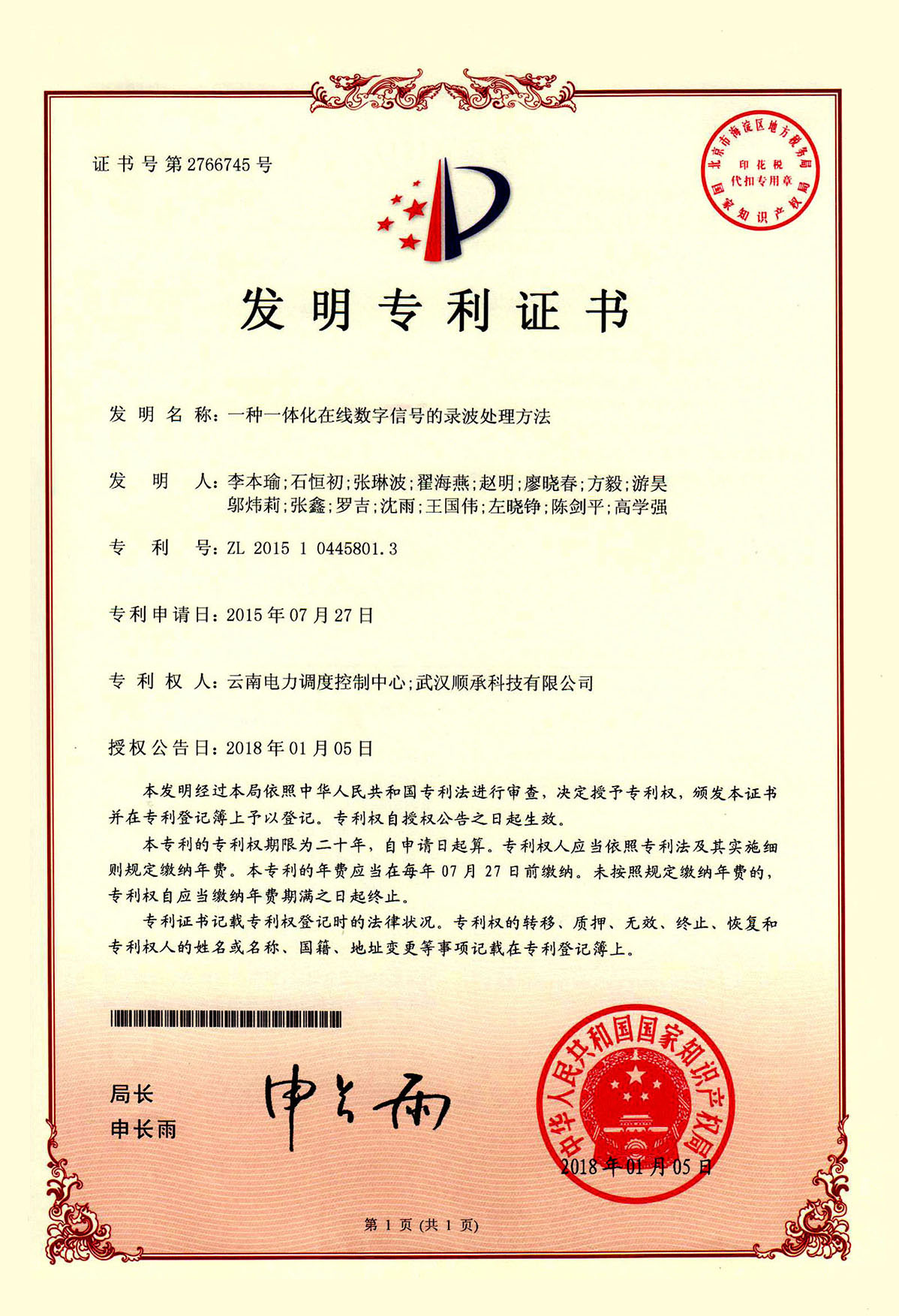公司近期收到国家知识产权局授予的两项发明专利,分别是“一种一体化在线数字信号的录波处理方法”(ZL 2015 1 0445801.3)和“一种智能变电站网络报文的裸盘存储方法”(ZL 2015 1 0445719.0),专利权期限20 年。