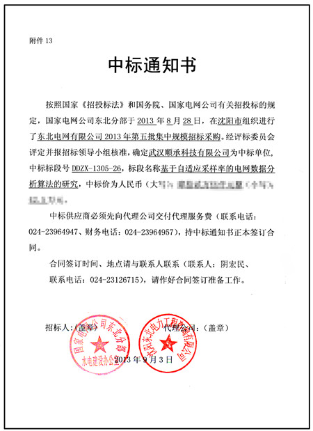 热烈祝贺公司在东北电网2013 年第五批集中规模招标采购中,中标“基于自适应采样率的电网数据分析算法的研究”项目,标段号DDZX-1305-26,标志着公司进一步稳固了东北市场。