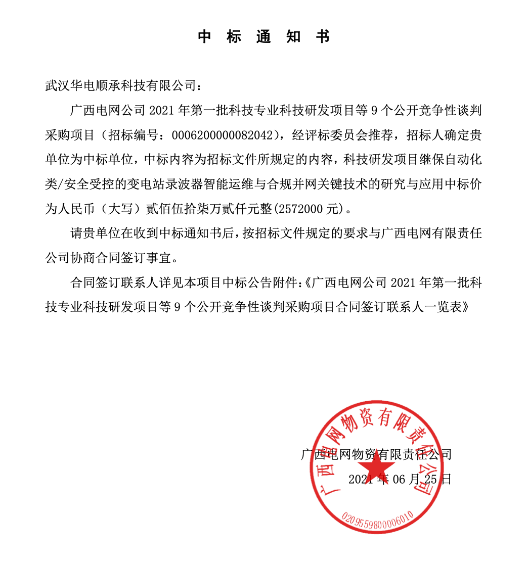 按广西电网公司2021 年第一批科技专业科技研发项目(招标编号:0006200000082042)中标结果公告,我公司中标继保自动化类“安全受控的变电站录波器智能运维与合规并网关键技术的研究与应用”(标包序号:6-1),属广西电网十大关键技术重点项目。